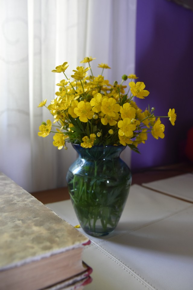 Luonnonkukista tehty kesäinen kimppu. Mikä olisikaan sen kauniimpaa katseltavaa! Kukkaloistoa on onneksi vielä paljon jäljellä tällekin kesälle. Tänä vuonna on monien lajien kohdalla ollut ilahduttavan runsas kukinta. Leinikkejäkin on jotenkin erityisen paljon ja ne ovatkin yksi lempikukistani. Leinikkikimpusta kannattaa tehdä matala, tiivis ja vähän pyöreän muotoinen, jolloin kukat pääsevät parhaiten oikeuksiinsa. Huomaa keltaisen ja violetin tehokas liitto. Vastavärit ovat todella näyttävät yhdessä.